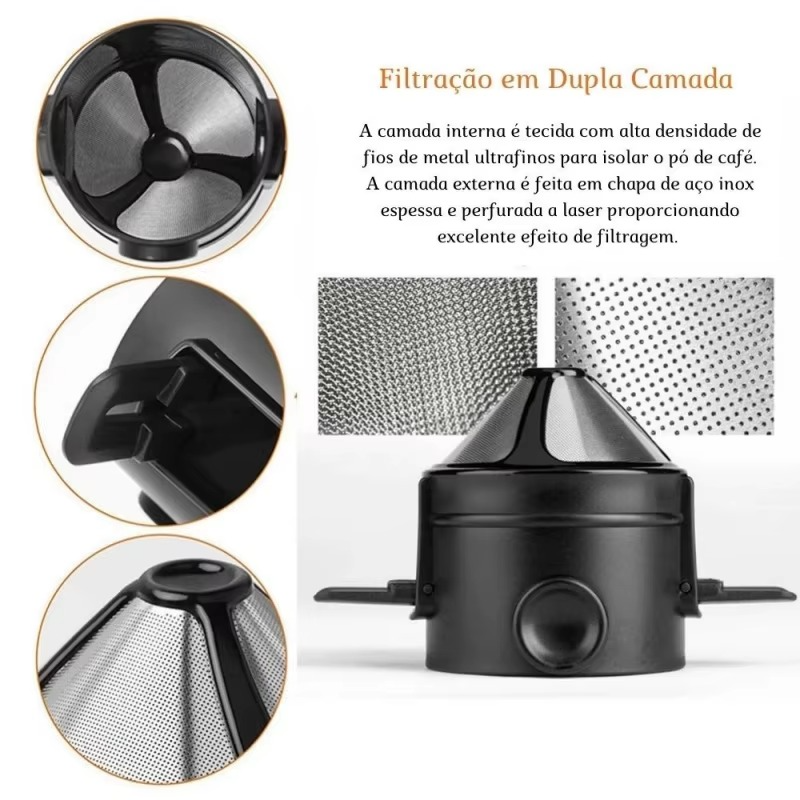 Para quem busca simplicidade, este filtro portátil é a escolha ideal! Basta abrir o suporte, inserir o café moído na parte apropriada e despejar a água quente lentamente. O resultado? Um café filtrado, com sabor puro e uma cremosidade natural que só o preparo manual pode oferecer. É uma experiência que café lovers de todos os níveis vão apreciar. Perfeito para quem quer começar o dia com mais energia e sabor, ou para aquele momento de pausa especial à tarde.